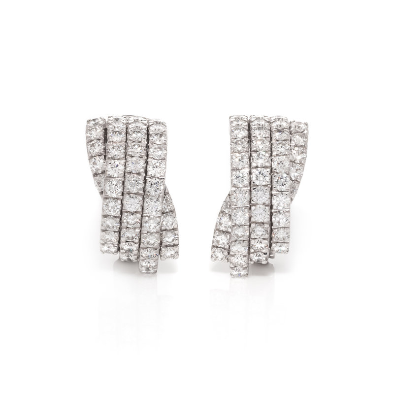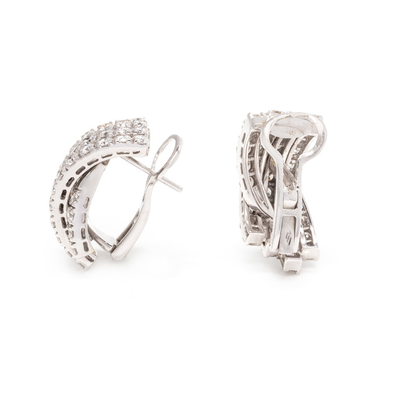 Containing 84 round brilliant cut diamonds weighing approximately 5.85 carats total, posts with clip backs. Mounted in white gold. 1 inch long.