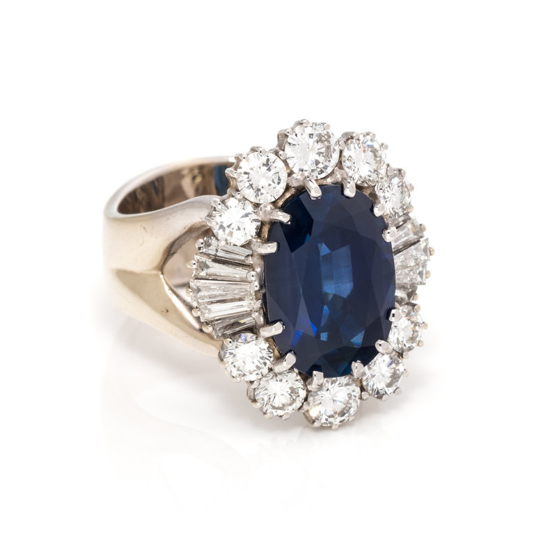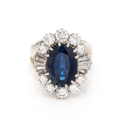 Containing one oval mixed cut sapphire measuring approximately 12.75 x 8.90 x 6.30 mm, 10 round brilliant cut diamonds weighing approximately 1.30 carats total and 10 tapered baguette cut diamonds weighing approximately 0.70 carat total. Mounted in white gold. Ring size 5.