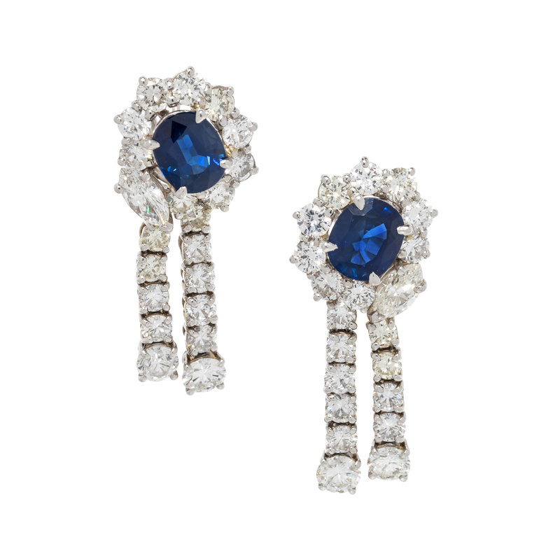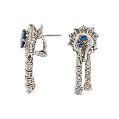 Containing two oval mixed cut sapphires measuring approximately 8.10 x 6.60 x 4.20 mm, two marquise and 40 round brilliant cut diamonds weighing approximately 6.25 carats total, posts with clip backs. Mounted in platinum. 1 3/8 inches long.