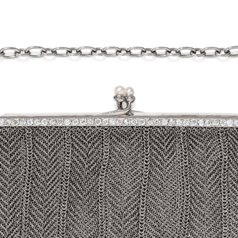 Consisting of a hinged frame containing 71 old mine cut diamonds weighing approximately 7.00 carats total, the clasp containing two pearls (origin not tested) and mixed cut diamonds, supporting a meshwork purse and suspended from a cable link chain. 5 1/2 x 5 3/4 inches.