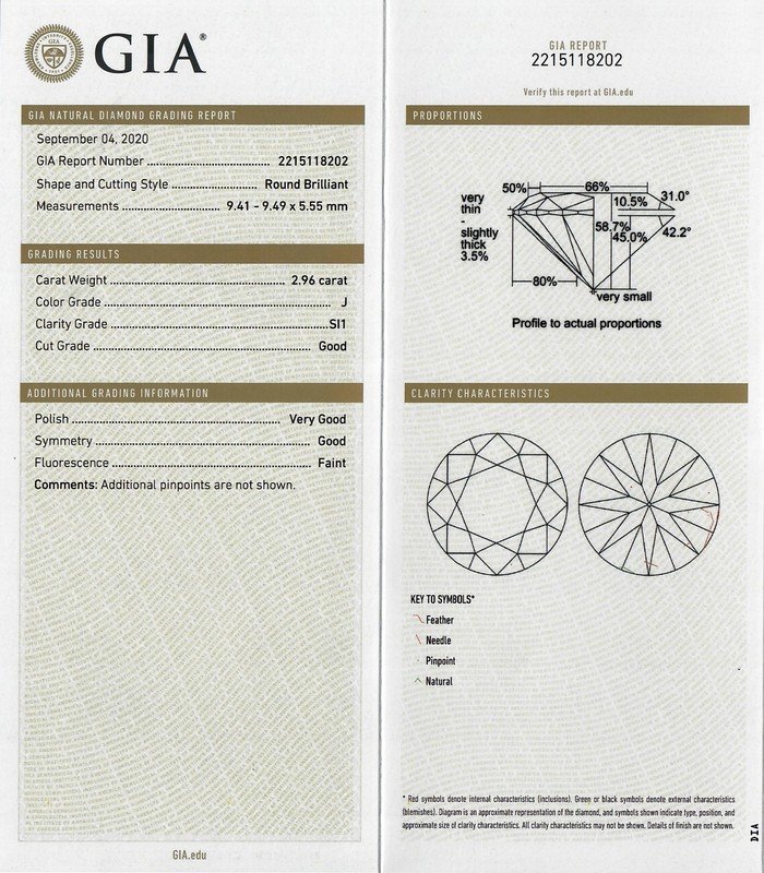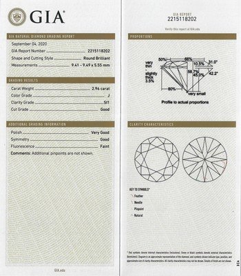 GIA, 2020, Report number 2215118202, 2.96 carats, J color, SI1 clarity, Faint fluorescence