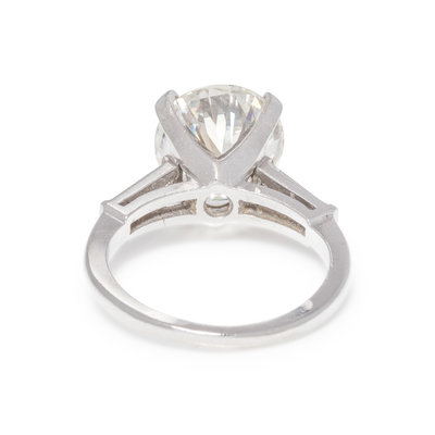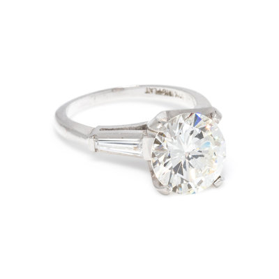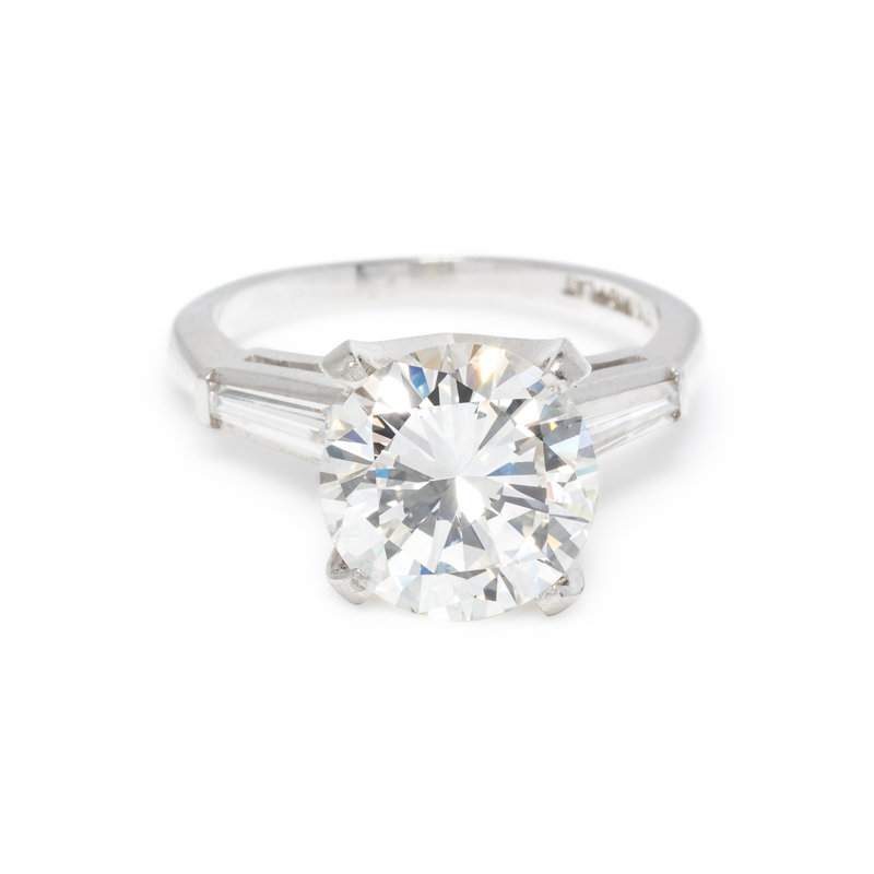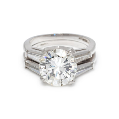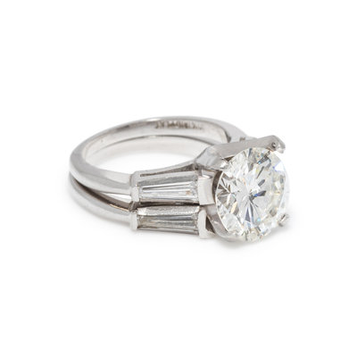 Containing one round brilliant cut diamond weighing 2.96 carats and two tapered baguette cut diamonds weighing approximately 0.35 carat total, together with a ring guard containing two tapered baguette cut diamonds weighing approximately 0.35 carat total. Mounted in platinum. Ring size 4 1/4.