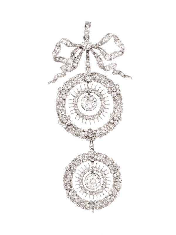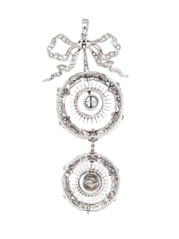 Consisting of a diamond bow suspending two diamond floral wreath forms with inner drops containing two old European cut diamonds weighing approximately 3.20 carats total. Mounted in platinum. 3 3/4 inches long.