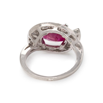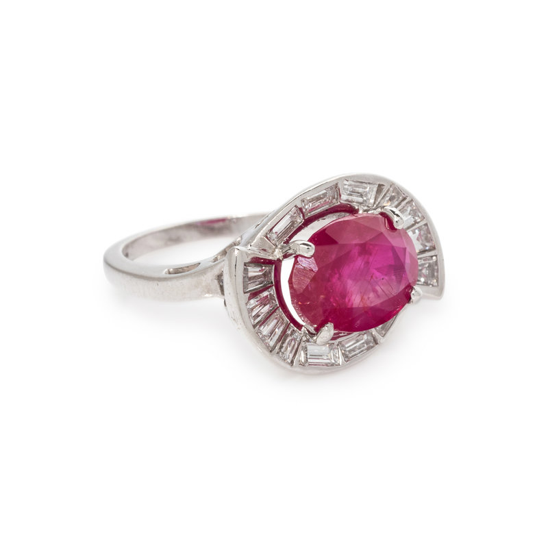 Containing one oval mixed cut ruby weighing 2.98 carats and 14 baguette cut diamonds weighing approximately 0.50 carat total. Mounted in platinum. Ring size 4 1/4.