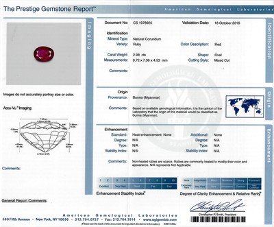 AGL, 2016, Report number 1078925, 2.98 carats, Natural Corundum, Ruby, Burma (Myanmar), Unheated