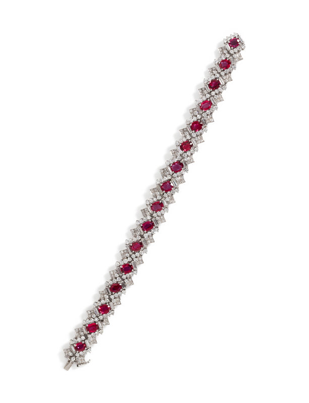 Containing 16 oval mixed cut rubies measuring approximately 5.45 x 4.35 mm to 6.55 x 4.50 mm, 32 baguette cut diamonds weighing approximately 3.50 carats total and 248 round brilliant cut diamonds weighing approximately 4.90 carats total. Mounted in white gold. 6 7/8 inches long.
