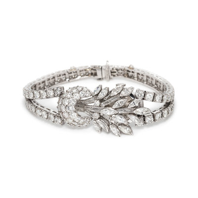The hinged dial, lugs and bracelet containing 14 marquise, 15 baguette and numerous round brilliant cut diamonds weighing approximately 9.50 carats total, matte silvered dial, applied baton numerals, Cal. 1700 17 jewel manual wind movement signed ROLEX. 6 3/8 inches long.