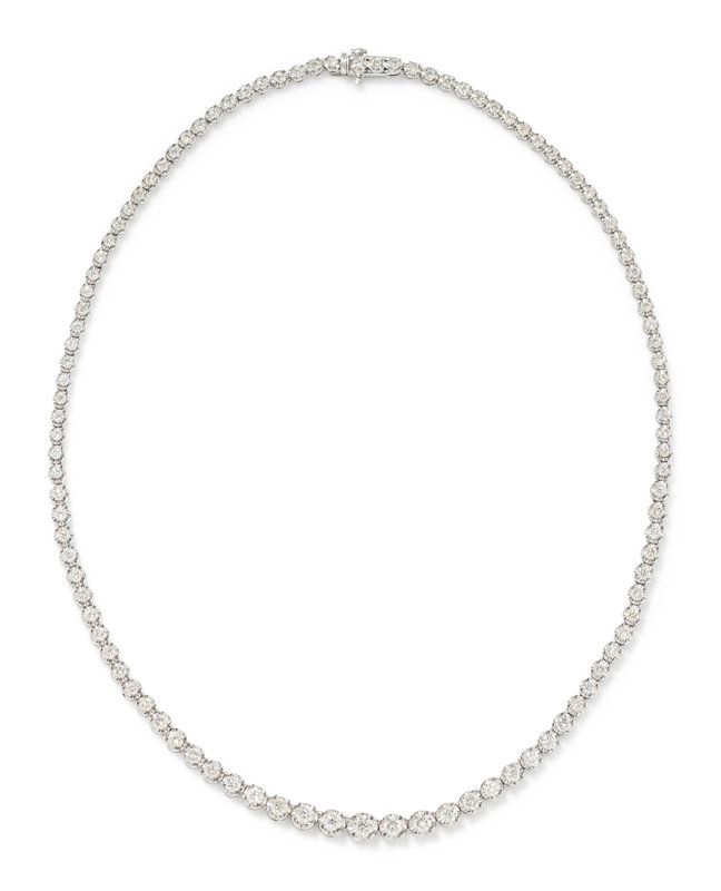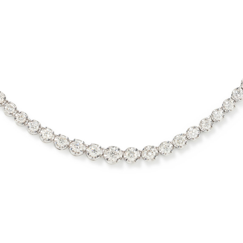 Containing 105 round brilliant cut diamonds weighing approximately 8.00 carats total. Mounted in white gold. 16 3/4 inches long.