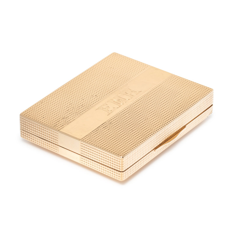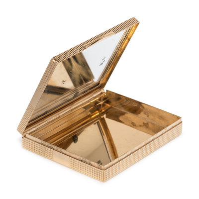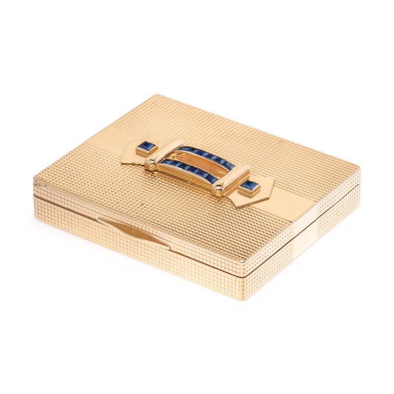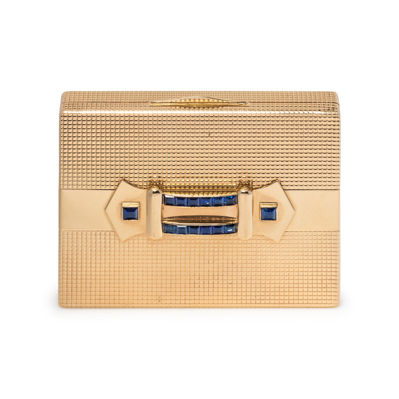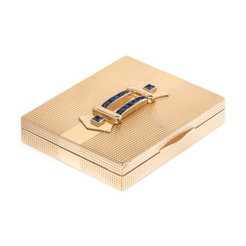 Consisting of a grid pattern hinged case, the top containing 14 square step cut sapphires and bottom with monogrammed engraving, with interior mirror. 2 3/8 x 2 7/8 inches.