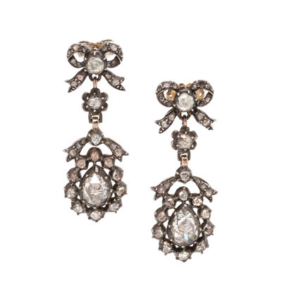 Containing two pear shaped rose cut diamonds measuring approximately 7.20 x 5.30 mm and 6.80 x 5.60 mm and numerous rose and mixed cut diamonds. Mounted in silver. 1 3/8 inches long.