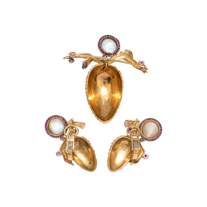 Consisting of a brooch containing one round cabochon moonstone measuring approximately 9.20 mm in diameter, two round mixed cut and numerous rectangular mixed cut rubies and one round brilliant cut diamond, together with a pair of earclips containing two round cabochon moonstones measuring approximately 9.15 mm in diameter, four round mixed cut and numerous rectangular mixed cut rubies and two round brilliant cut diamonds. Brooch: 1 15/16 x 1 7/8 inches, Earclips: 1 1/2 inches long.