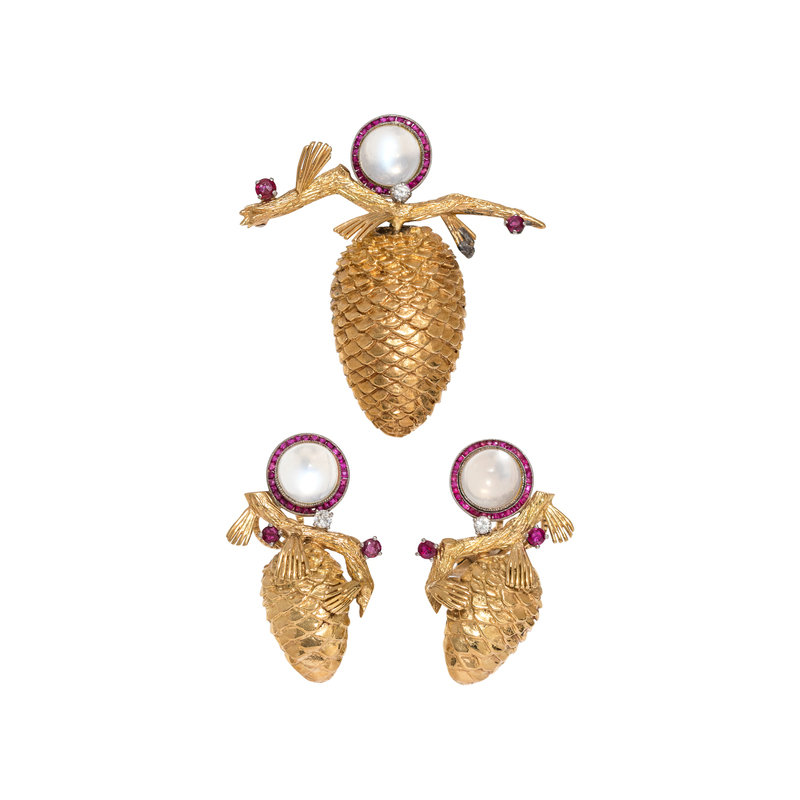 YELLOW GOLD, MOONSTONE, RUBY AND DIAMOND PINECONE SET