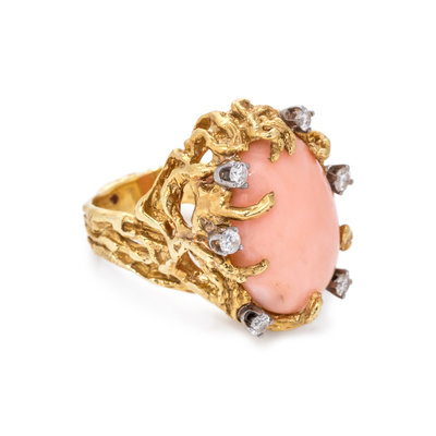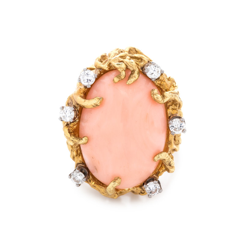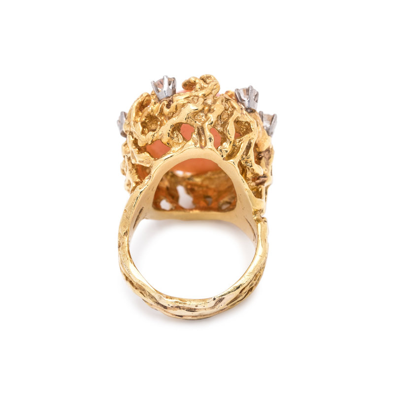 Containing one oval cabochon coral measuring approximately 21.75 x 16.00 x 6.10 mm and six round brilliant cut diamonds weighing approximately 0.45 carat total. Mounted in yellow gold. Ring size 7 3/4.