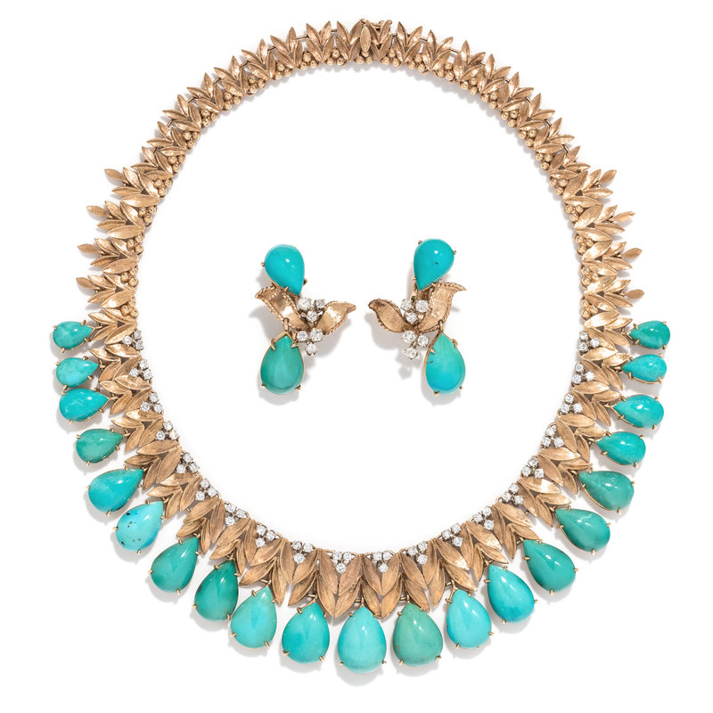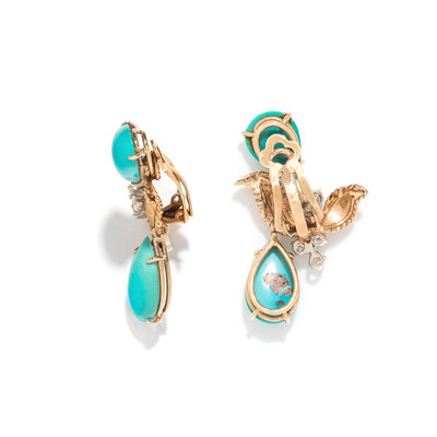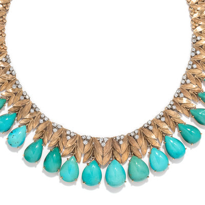 Consisting of a necklace containing 21 pear cabochon turquoise drops measuring approximately 10.00 x 7.00 to 16.00 x 12.00 mm and 60 round brilliant cut diamonds weighing approximately 2.40 carats total, together with a pair of earclips containing four pear cabochon turquoise measuring approximately 14.00 x 9.00 to 16.00 x 10.00 mm and 12 round brilliant cut diamonds weighing approximately 1.00 carat total. Necklace: 15 1/4 inches long. Earclips: 1 1/2 inches long.