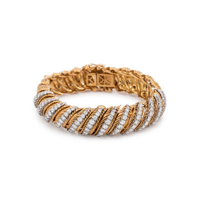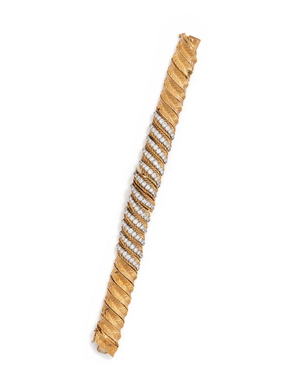 Consisting of half-domed leaf motif links, the central links containing numerous round brilliant cut diamonds weighing approximately 5.00 carats total with hinged cover concealing watch with 17 jewel manual wind movement signed EMEWO. 7 inches long.