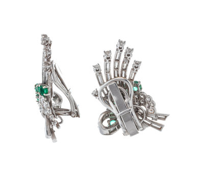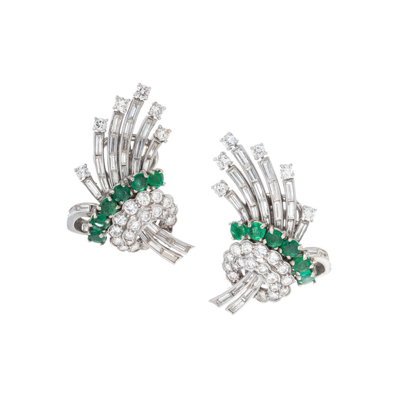 Containing 52 baguette cut diamonds weighing approximately 2.35 carats total, 48 round brilliant cut diamonds weighing approximately 1.40 carats total and 12 round mixed cut emeralds. Mounted in platinum with white gold clip backs. 1 3/8 inches long.