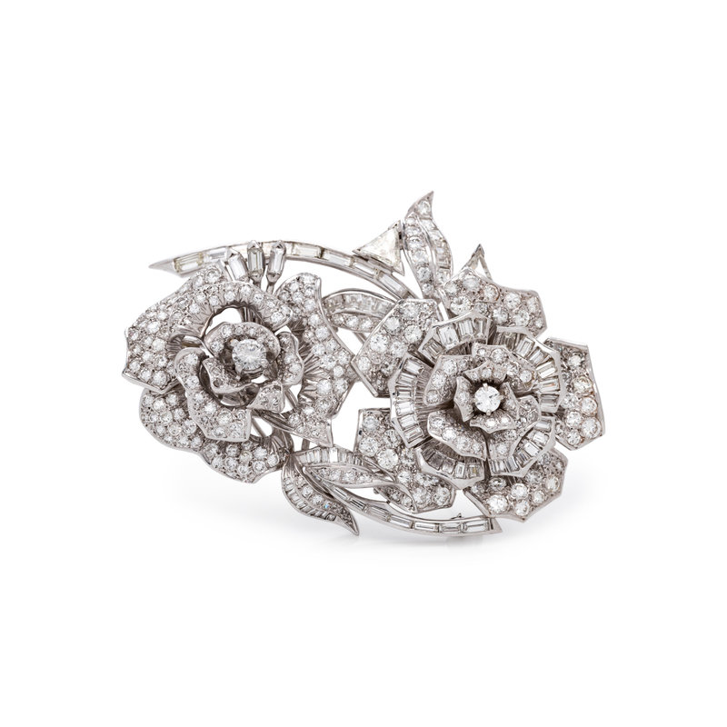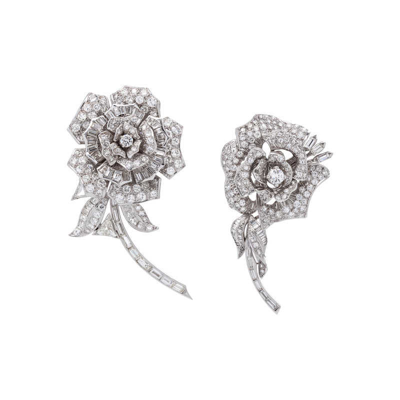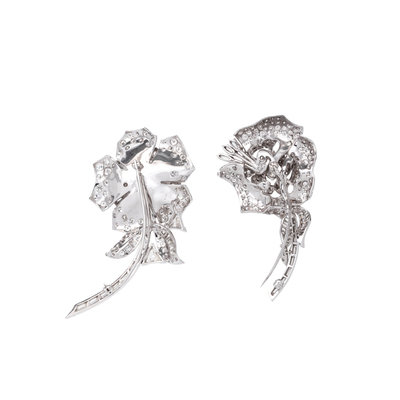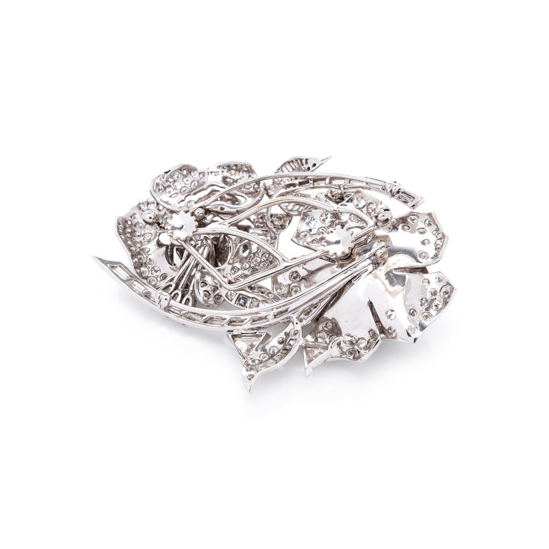Consisting of one flower brooch containing two triangular, 45 baguette and 104 round brilliant and single cut diamonds weighing approximately 6.50-7.50 carats total, with a second flower brooch containing one round brilliant, 29 baguette and 153 round brilliant and single cut diamonds weighing approximately 5.50-6.50 carats total, together with an openwork frame allowing them to be worn as a single brooch. Mounted in white gold. 2 7/8 x 1 1/2 inches.