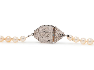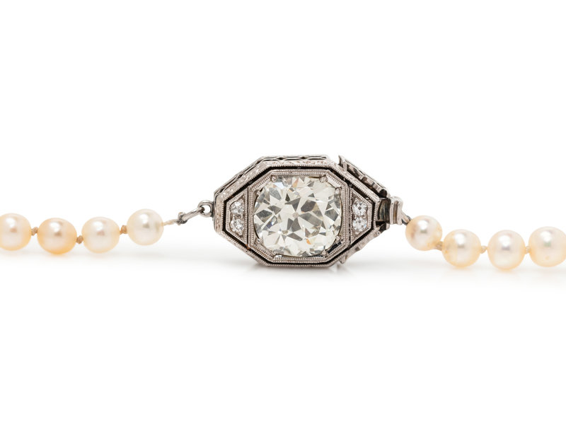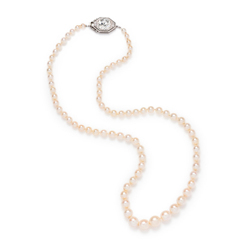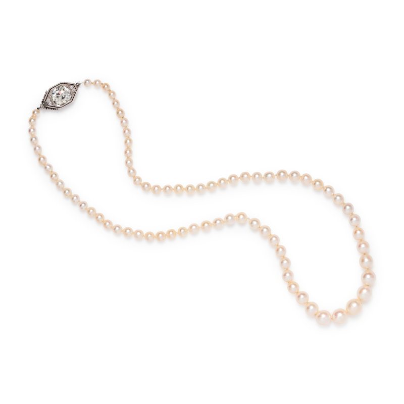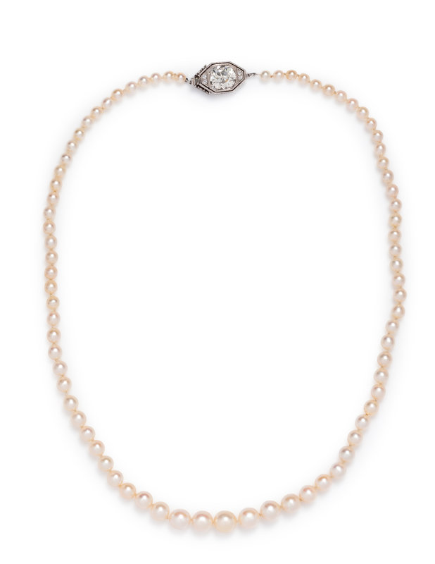 Consisting of 77 natural pearls measuring 3.77-7.82 mm, strung knotted in a graduated style with a platinum clasp containing one old mine cut diamond weighing 2.89 carats and four single cut diamonds. 18 inches long.