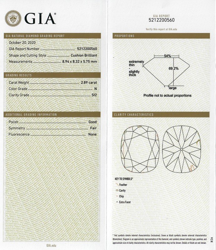 GIA, 2020, Report number 5212200560, 2.89 carats, N color, SI2 clarity, No fluorescence