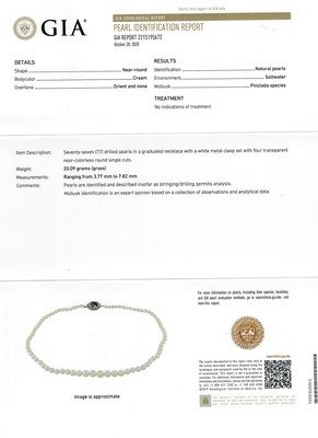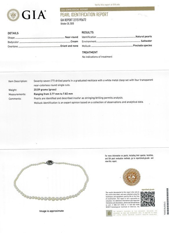 GIA, 2020, Report number 2215195672, Natural Pearl, Saltwater, Pinctada, Near-round shape, Cream color, Orient and none overtone