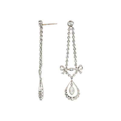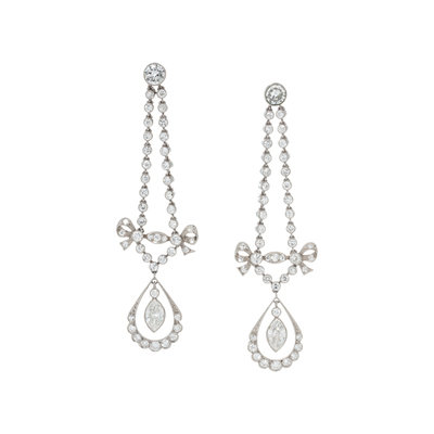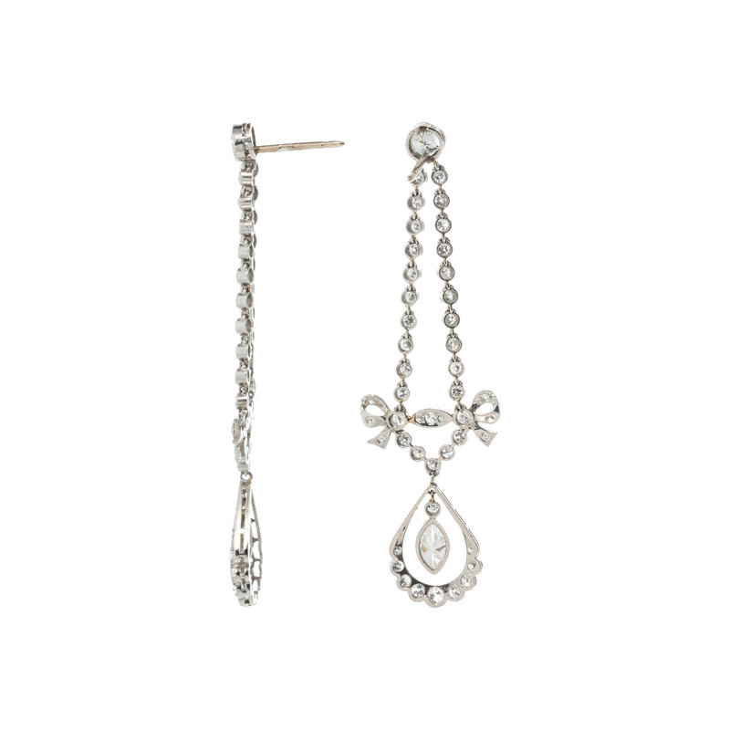 Containing two marquise, two transitional and numerous old European cut diamonds weighing approximately 2.40 carats total. Mounted in platinum with white gold posts and backs. 2 1/4 inches long.