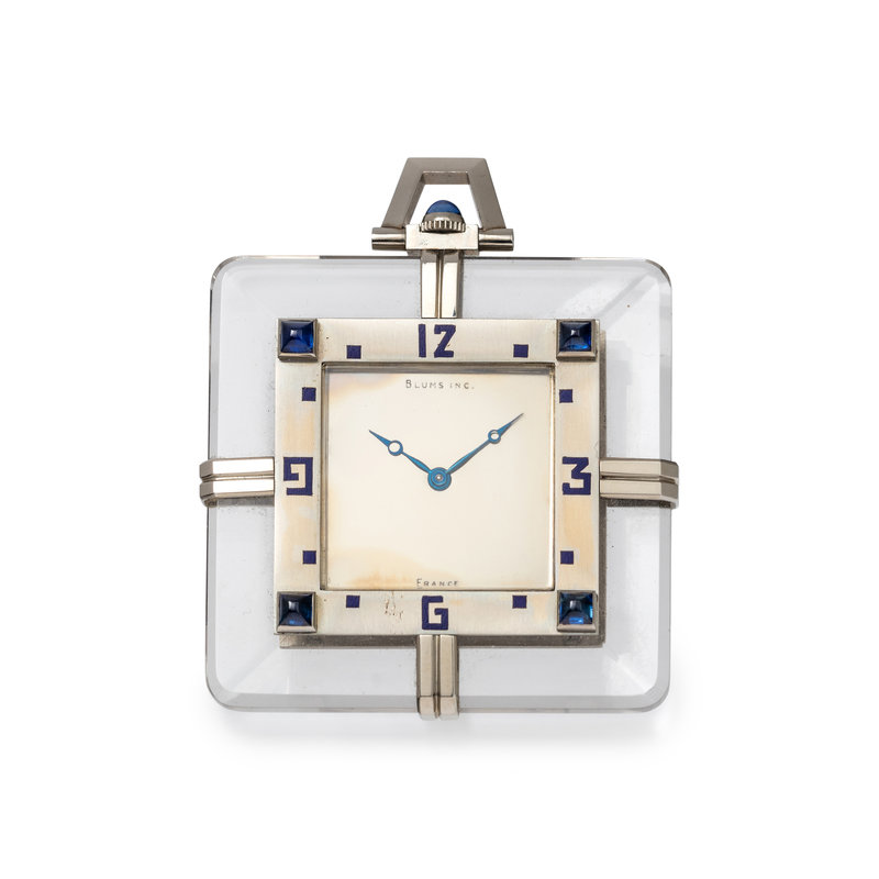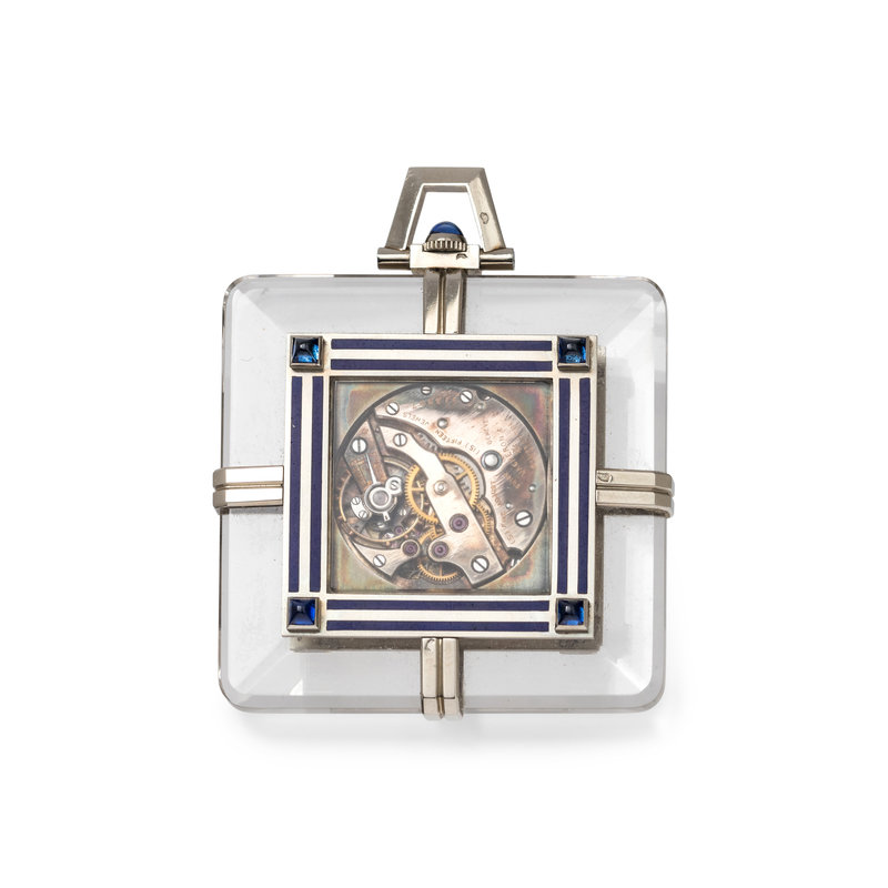 29.00 x 29.00 mm case diameter with rock crystal surround, the bezel with blue enamel square and Arabic numerals and containing eight sugarloaf sapphires, mirror finish dial, exhibition case back, manual wind 15 jewel movement signed VACHERON & CONSTANTIN. 2 5/8 inches wide.