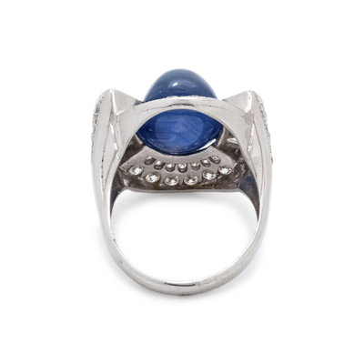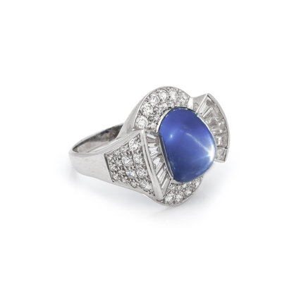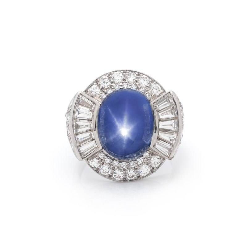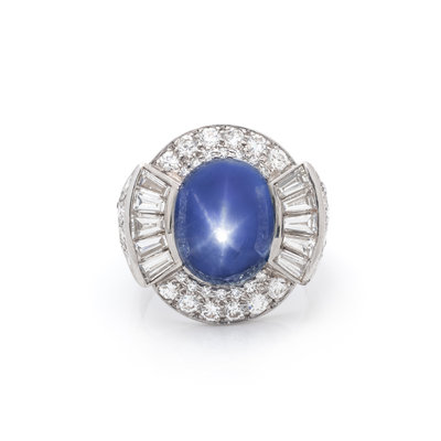 Containing one oval cabochon star sapphire measuring approximately 12.80 x 9.60 x 8.80 mm, 10 tapered baguette cut diamonds weighing approximately 0.95 carat total and 56 transitional and single cut diamonds weighing approximately 1.25 carats total. Mounted in platinum. Ring size 6 3/4.
