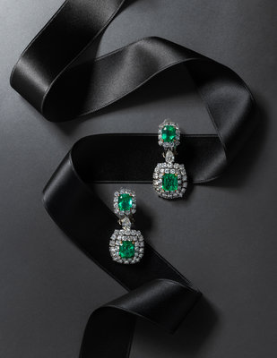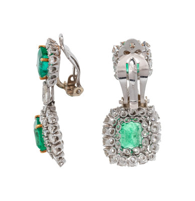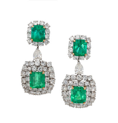 Containing four emerald cut emeralds weighing approximately 11.00-13.00 carats total, two pear shaped diamonds weighing approximately 1.00 carat total and 88 round brilliant cut diamonds weighing approximately 6.00-7.00 carats total. Mounted in platinum. 1 5/8 inches long.