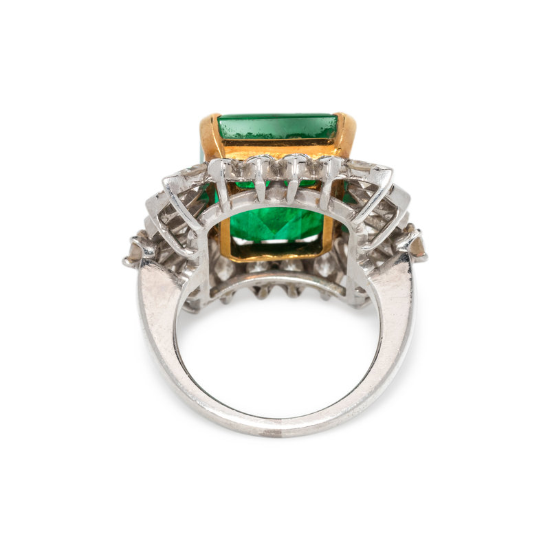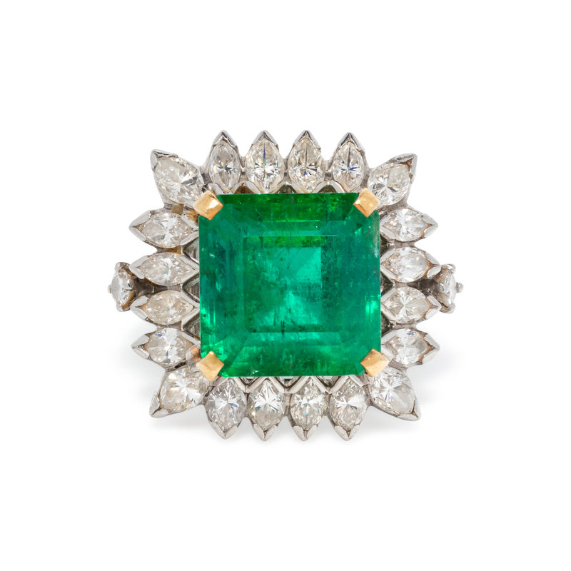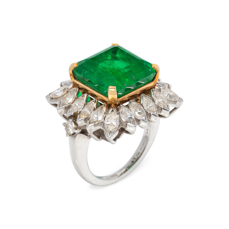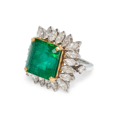 Containing one emerald cut emerald measuring approximately 12.48 x 12.36 x 9.55 mm, 20 marquise and two round brilliant cut diamonds weighing approximately 1.20 carats total. Mounted in platinum. Ring size 5 1/2.