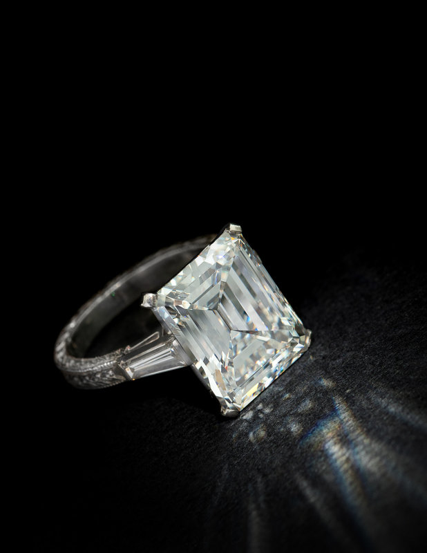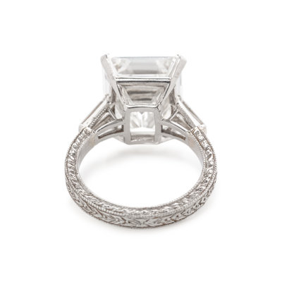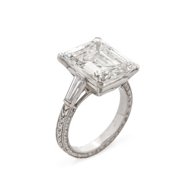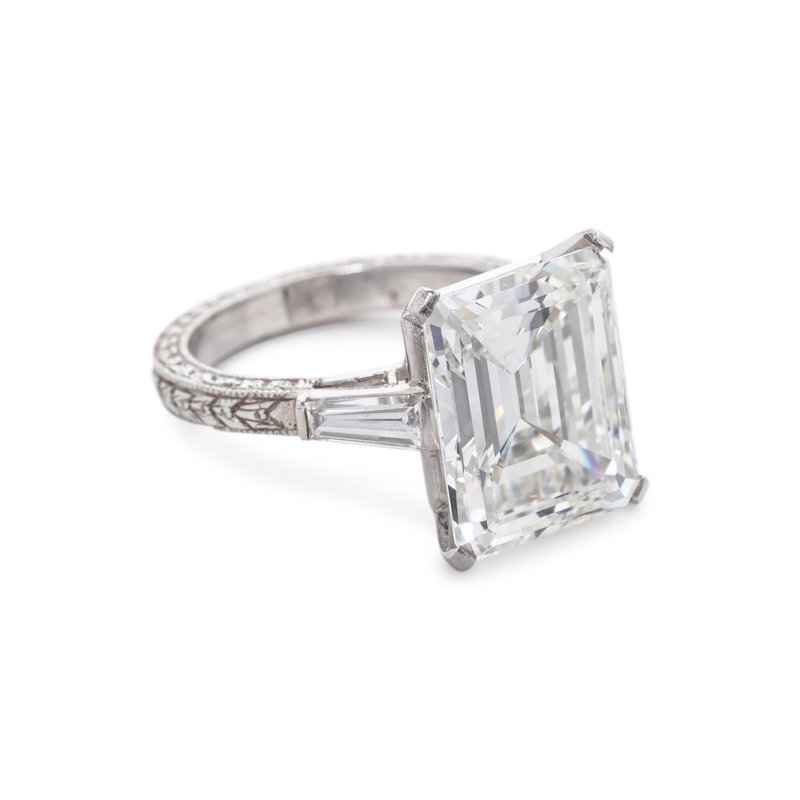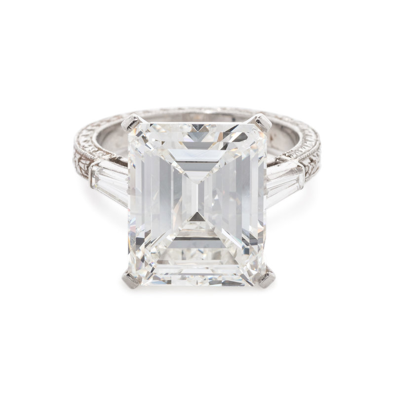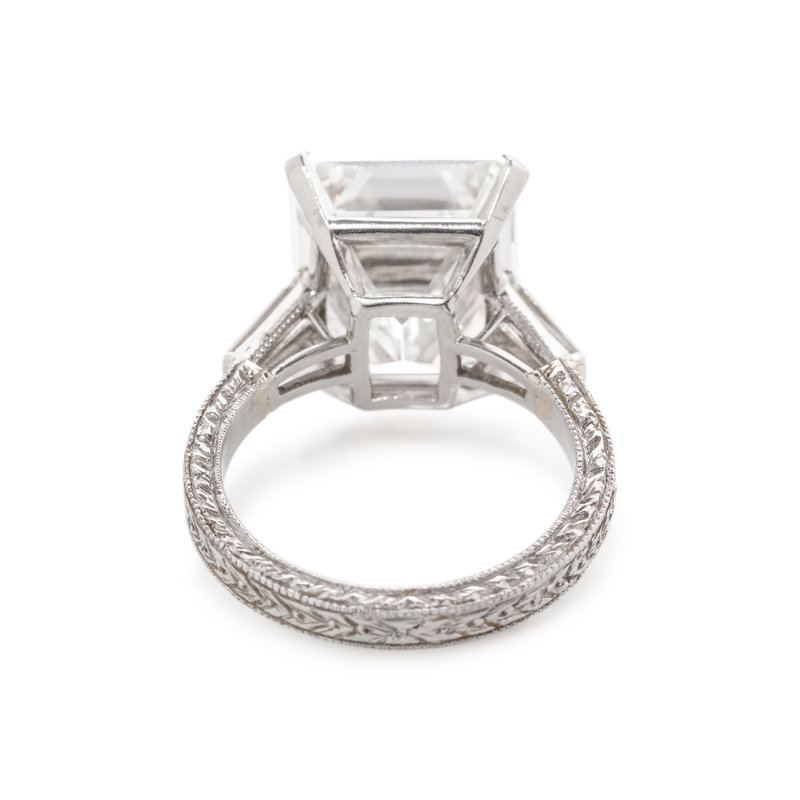 Containing one emerald cut diamond weighing 11.78 carats and two tapered baguette cut diamonds weighing approximately 0.50 carat total. Mounted in platinum. Ring size 8.