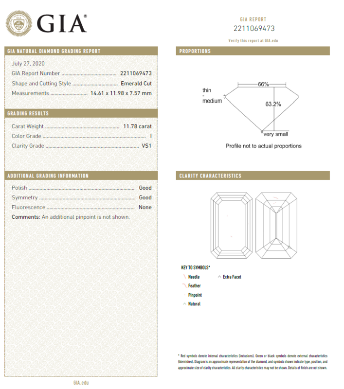 GIA, 2020, Report number 2211069473, 11.78 carats, I color, VS1 clarity, No fluorescence