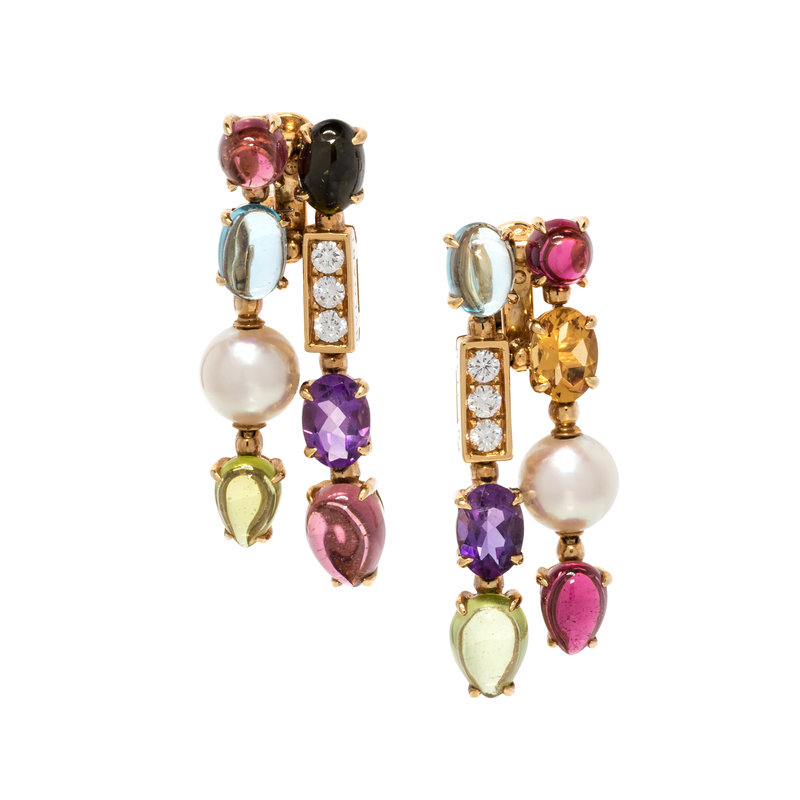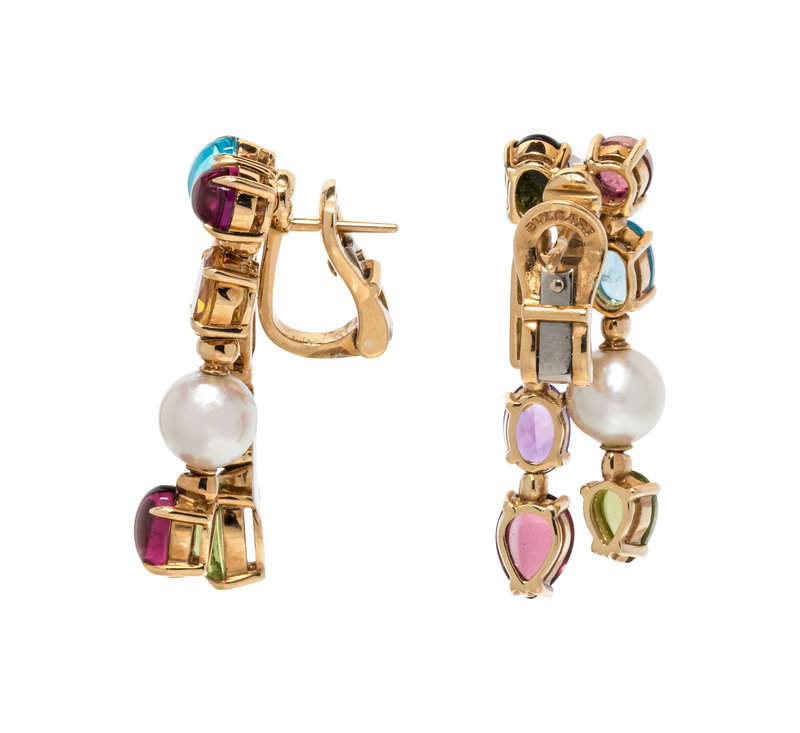 Containing six round brilliant cut diamonds weighing approximately 0.25 carat total, two cultured pearls measuring approximately 7.30 mm in diameter and 12 mixed cut and cabochon gemstones of various shape and size including peridot, blue topaz, pink tourmaline and amethyst, posts with clip backs. Mounted in yellow gold. 1 3/8 inches long.