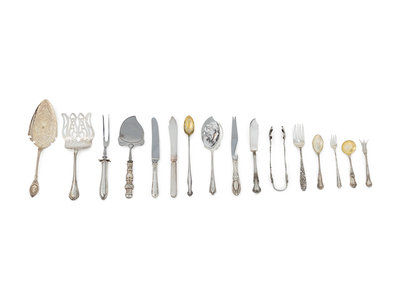 comprising 67 miscellaneous silver flatware and serving pieces, plus eight Christofle spoon rests