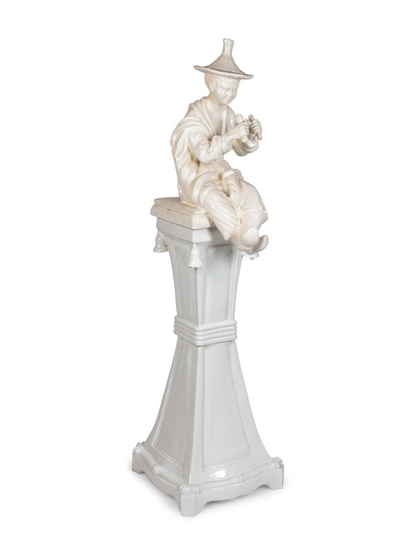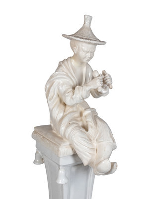 A Continental Blanc de Chine Figure of a Seated Chinese Man on a Pedestal