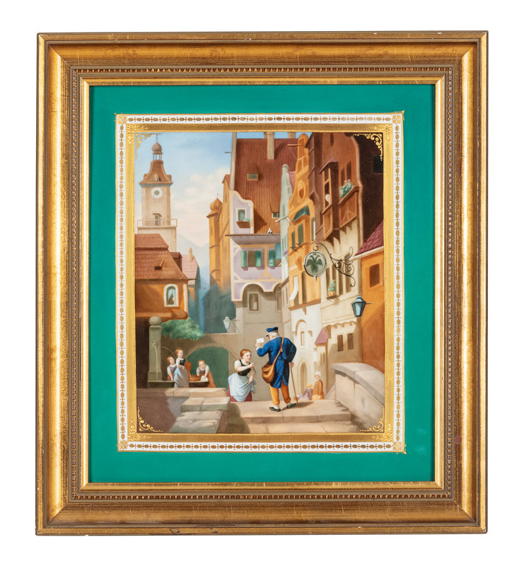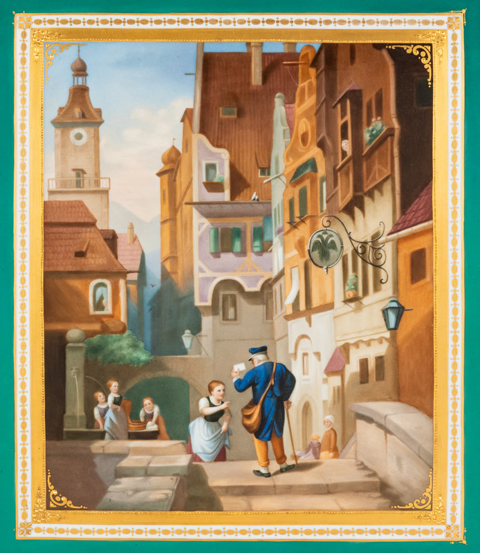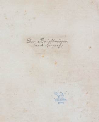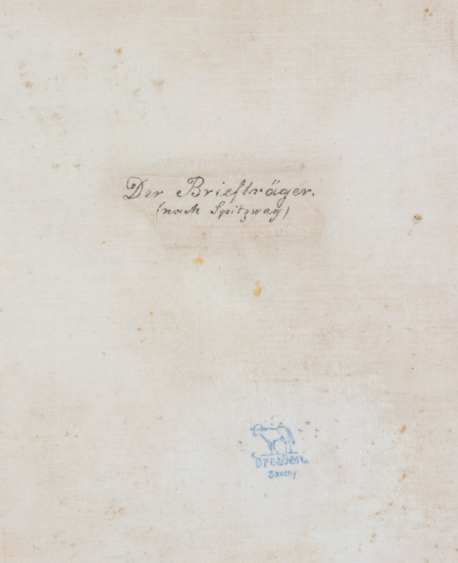 inscribed Der Briefträger after Carl Spitzweg (German, 1808-1885) and with transfer-printed Dresden Saxony mark to the reverse.