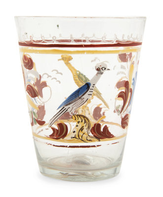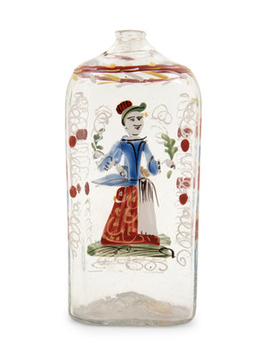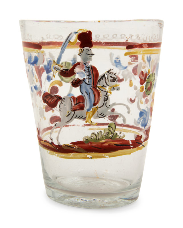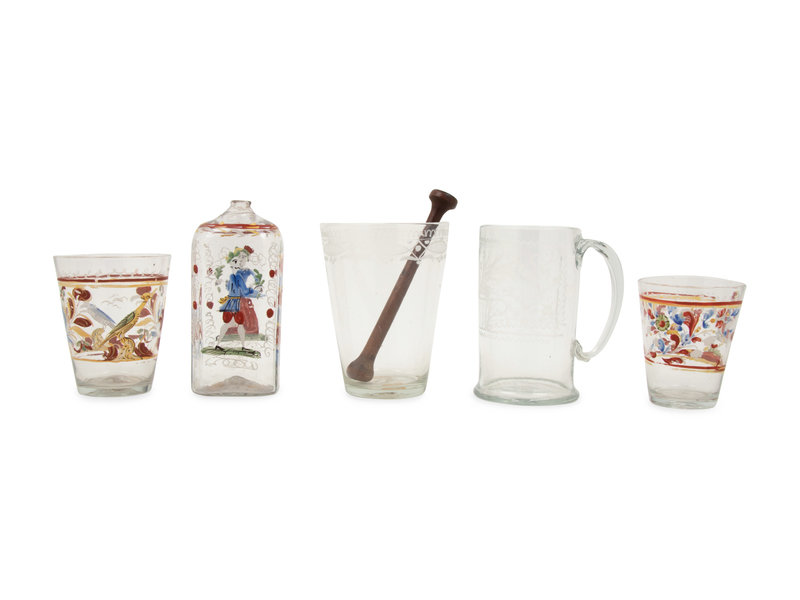 comprising a polychrome decorated flask, two tumblers and a cut glass mug and tumbler, together with a wood pestle.
