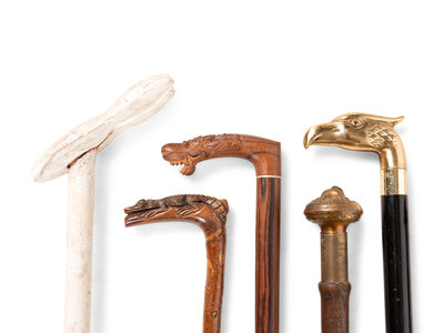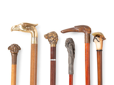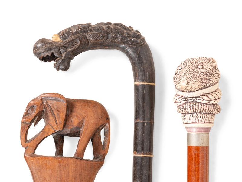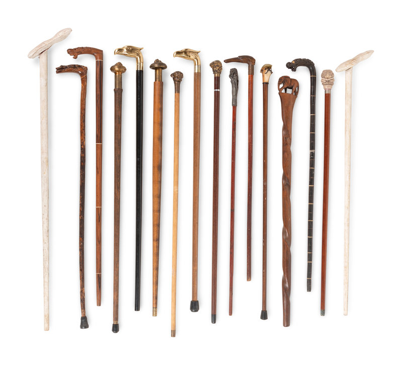 A Collection of Sixteen Carved and Mixed Metal Decorated Zoomorphic Walking Sticks