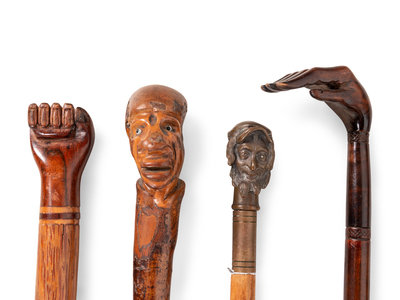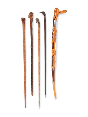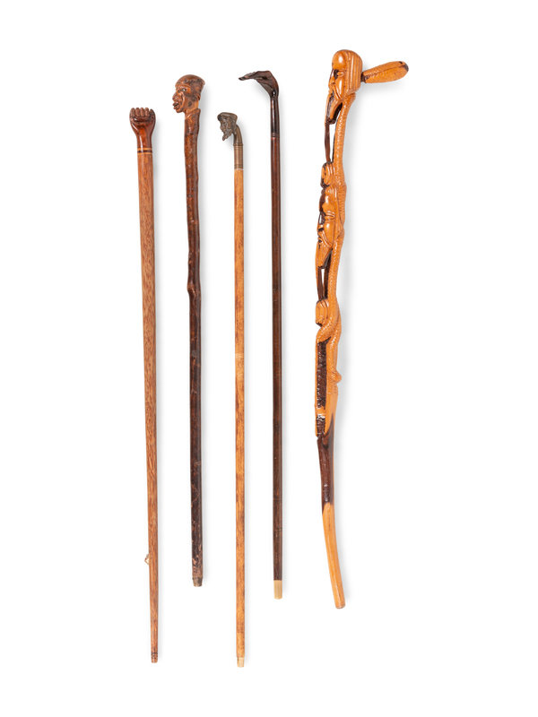 comprising four carved wood examples and a metal example with a mask-form handle.
