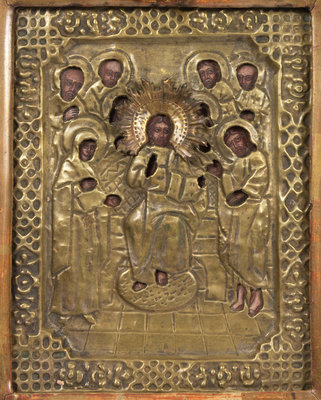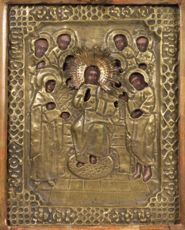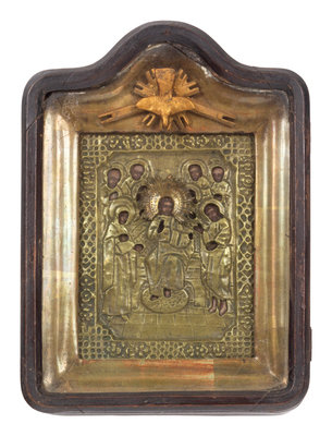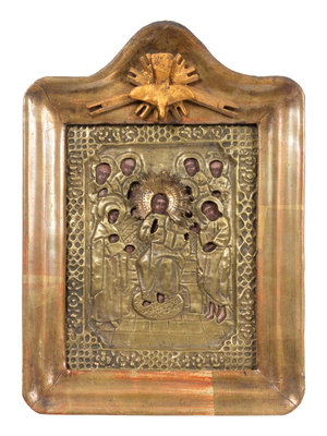A Russian Pressed Brass Oklad Mounted Icon in Case