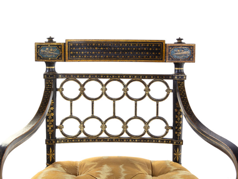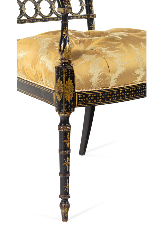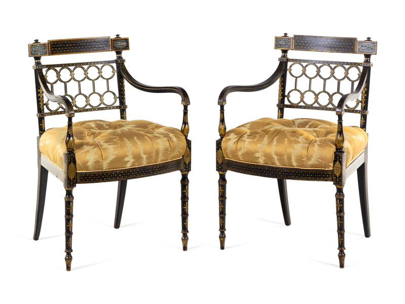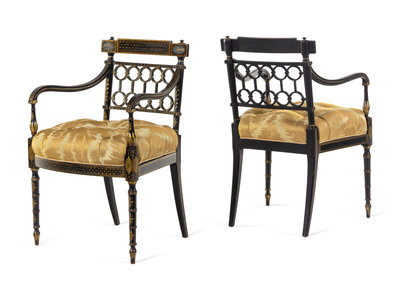 A Pair of Regency Style Gilt and Black Lacquered Armchairs