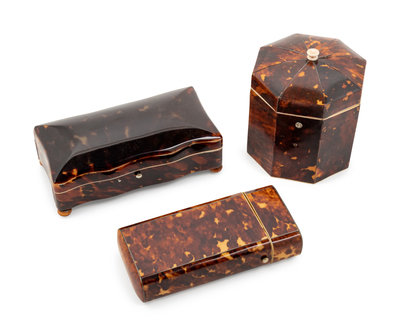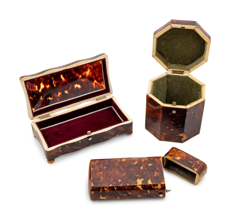 comprising an octagonal tea caddy, an undulating jewelry box and a glasses case.