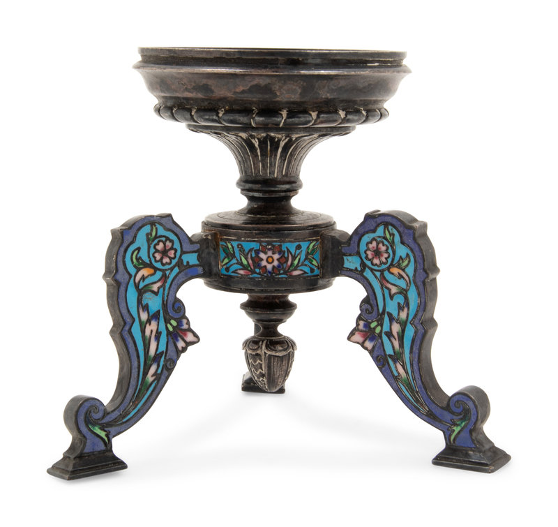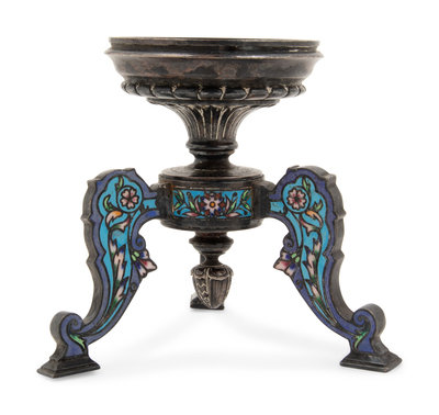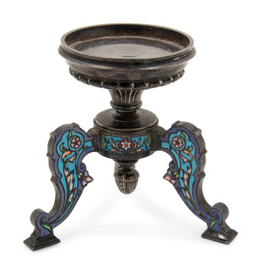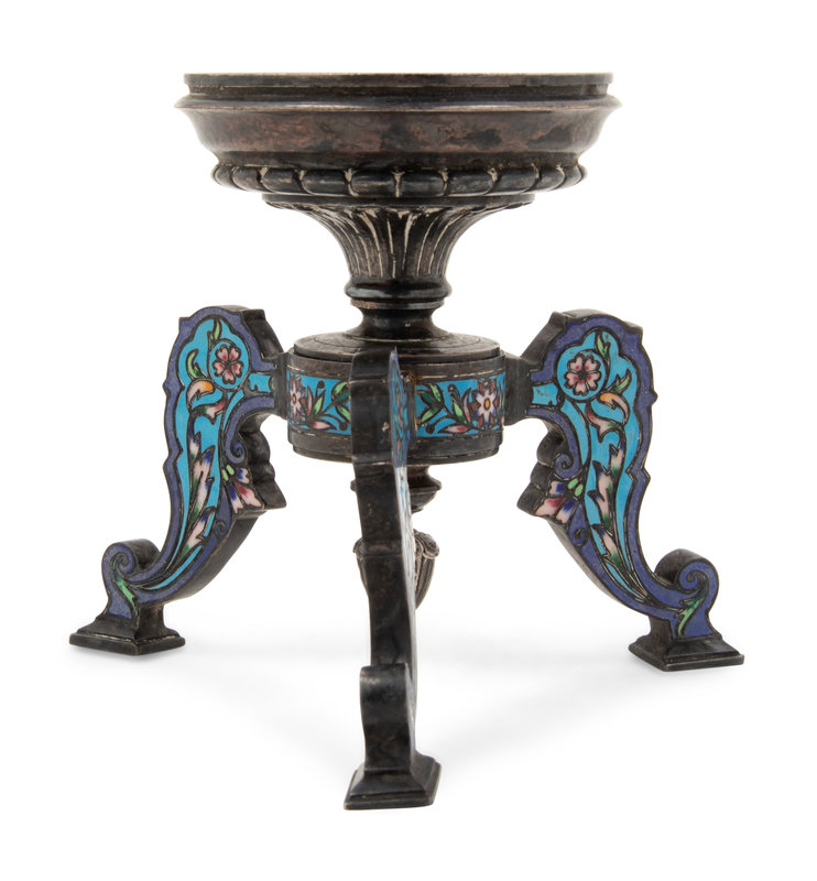 A Continental Silvered Metal and Enamel Tripod Stand