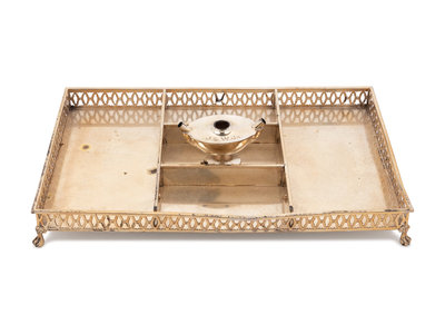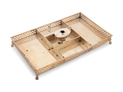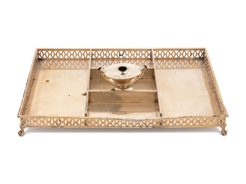 having a pierce decorated gallery surrounding a compartment centered with an oil lamp engraved J.S.W Jr. and raised on four paw feet.