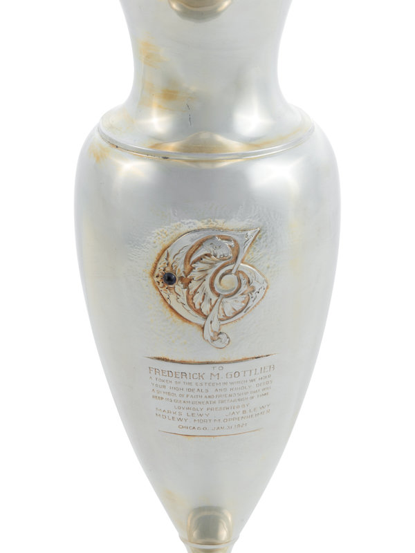 the body with the engraved inscription, To Frederick M. Gottleib/ A Token of the Esteem in Which We Hold/ Your High Ideals and Kindly Deeds/ a Symbol of Faith and Friendship That Will/ Keep Its Gleam Beneath the Tarnish of Time/ Lovingly Presented By/ Mark S. Lewy, Jay B. Lewy, M.D. Lewy, Mort. M. Oppenheimer/ Chicago, Jan. 31, 1921.