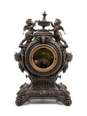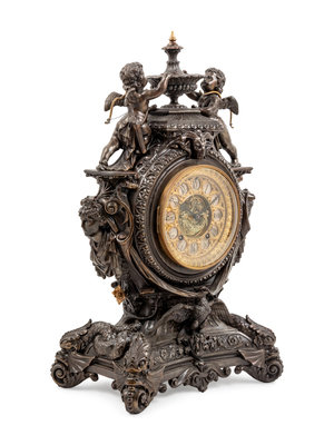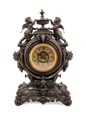 An Ansonia Lydia Patinated Metal Figural Mantel Clock