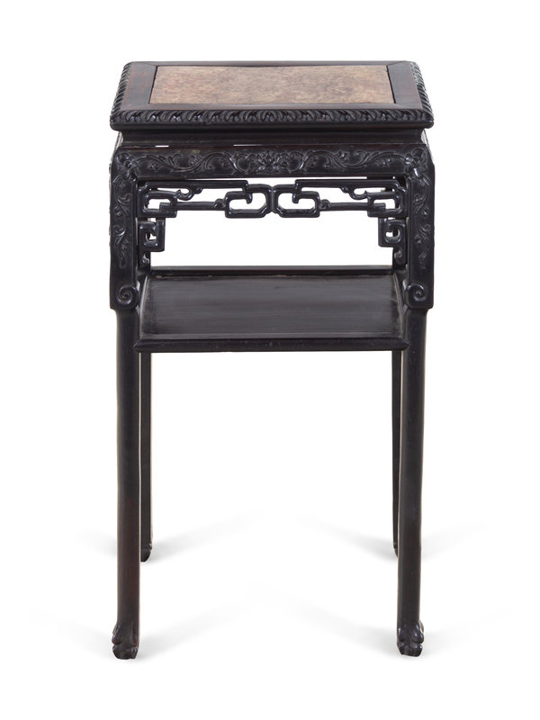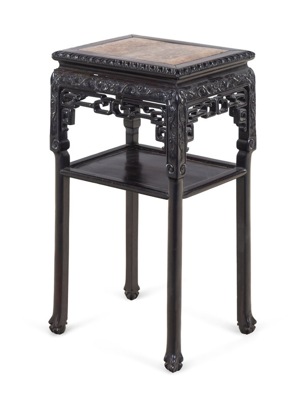 A Chinese Export Carved and Marble-Inset Rosewood Jardinière Stand