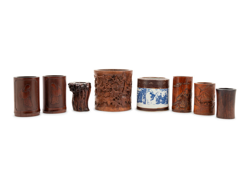 A Group of Chinese Hardwood and Porcelain Brush Pots