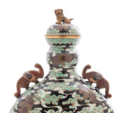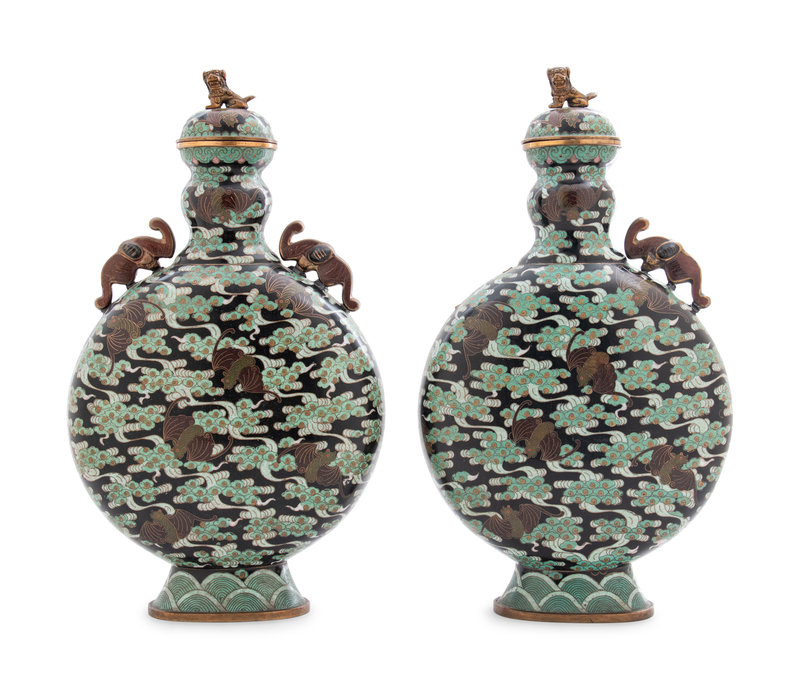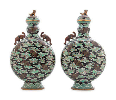 A Pair of Chinese Export Cloisonné Moon Flasks with Covers