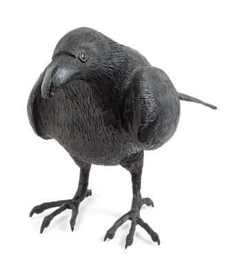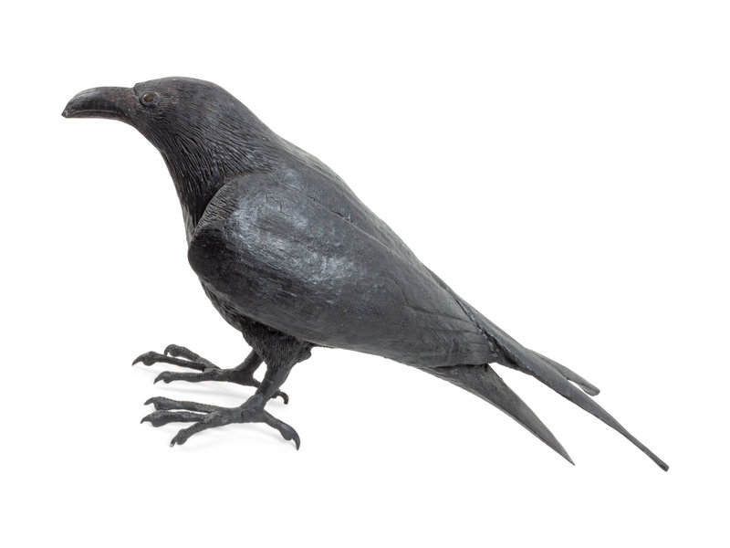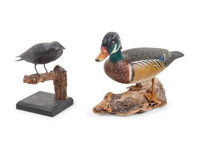 includes a large carved crow, a carved raven perched on a branch (illegible signature to underside) and a carved and polychrome painted duck with metal feet signed Ken Kirby