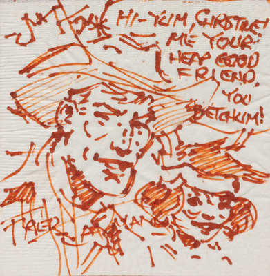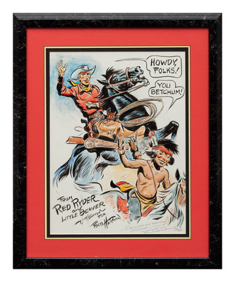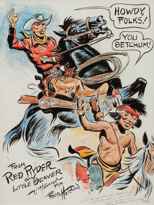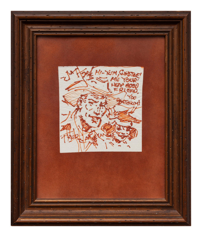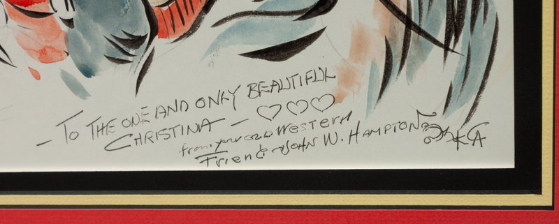 signed John W. Hampton and dedicated (lower left),together with a Fred Harman drawing on napkin